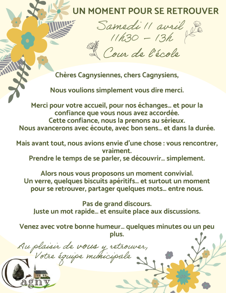 🌿 Un moment pour se retrouver à Cagny 💬 Un temps convivial pour échanger, faire connaissance… et créer du lien simplement. ✔️ Événement passé 👉 La nouvelle équipe municipale a proposé un moment simple et convivial pour se rencontrer et…